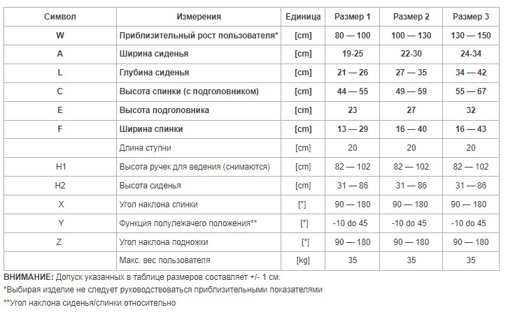 Диапазон регулировки углов наклона спинки, сидения и подножек способствует отдыху ребенка в положении лежа.